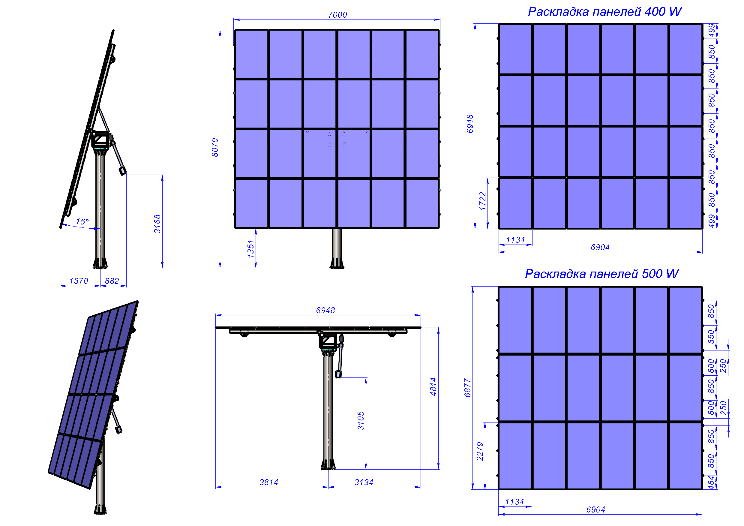Конструкция трекера рассчитана для установки на массива солнечных панелей с общей номинальной мощностью 10 кВт: 28 панелей по 330 Вт (1×1.6) м, 24 панели по 450 Вт (1.13×1.72) м или 18 панелей по 500–600–700 Вт (1.13×2.28) м. Изменение вектора ориентации производится по двум осям: по азимуту X в диапазоне от -135º до +135º и элевации Y от -75º до 0º.